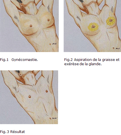 La gynécomastie désigne une hypertrophie de la glande mammaire chez l’homme, elle peut être uni- ou bilatérale. Les causes peuvent être soit un excès de graisse sans atteinte de la glande mammaire, on parlera d’adipomastie , et l’intervention correctrice se fera par liposuccion. Soit, la glande mammaire est hypertrophiée (due à un développement hormonal anormal), elle sera alors traitée chirurgicalement. Soit et dans la plupart des cas, l’hypertrophie fait suite à la combinaison d’un excès adipeux et d’un dérèglement hormonal, l’intervention correctrice associera alors une liposuccion de la graisse à l’ablation de la glande mammaire.
